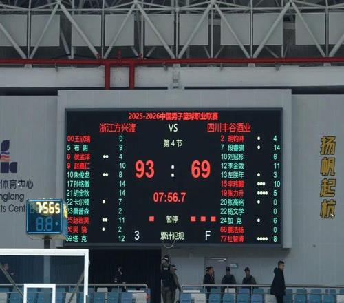 最后一节,赵嘉仁接球三分命中,李金效上篮得到2分。吴骁挡拆顺下完成得分,赵岩昊远投应声入网。随后双方换上全华班,李玮颢双手扣篮,赵嘉仁先是跳投三分命中,随后接到侯孟泽传球完成灌篮。此后两队分差始终保持在20分以上,比赛失去悬念,最终浙江方兴渡主场以93-69战胜四川丰谷酒业。